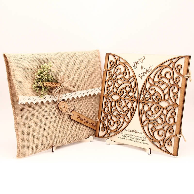 Ahşap düğün davetiyesi modellerinde minimum sipariş 10 adet olarak belirlenmiştir.