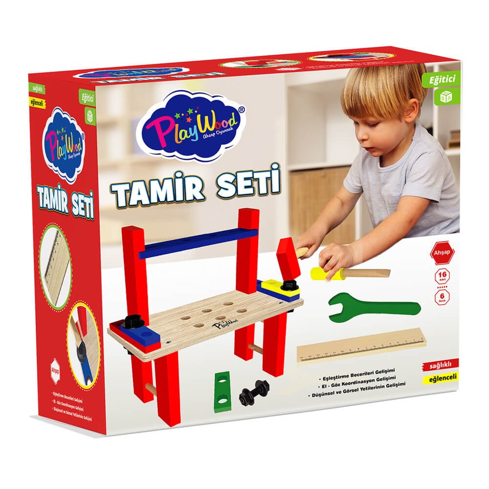 Tamamen Ahşap Parçalar: Eğitici oyuncak tamir seti, dayanıklı ve çevre dostu ahşap malzemelerden yapılmıştır. %100 ahşap malzemeden üretilmiş olup, CE standartlarına göre Türkiye'de üretilmiştir.