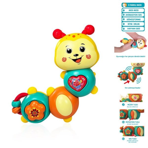 Işıklı ve Müzikli Hareketli Parçalar Tırtıl Bebek Piyanosu VR-855-142A, bebeklerin ilgisini çekecek çeşitli müzik ve ses efektleri ile donatılmıştır. Bu oyuncak, bebeklerin hem eğlenmesini hem de öğrenmesini sağlar. Farklı hayvan sesleri ile bebekler, hayvanları tanıma ve seslerini ayırt etme becerilerini geliştirirler. Aynı zamanda müzik ve ışık efektleri, bebeklerin duyu gelişimini destekler.