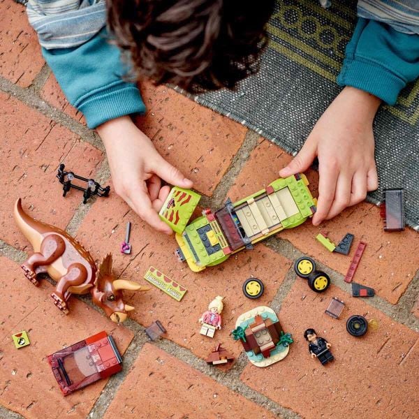 Tamamı inşa edilebilir Ford Explorer Oyuncak, Jurassic Park SUV'un orijinal detaylarıyla doludur ve hem minifigürler hem de navigasyon sistemi için yer içerir. Oyuncak dinozor ve 2 minifigür, Görünür Triceratops figürü, ayrıca Ian Malcolm ve Dr. Ellie Sattler müsait olacak. Dinazora tuvalet eğitimi lazım !!!