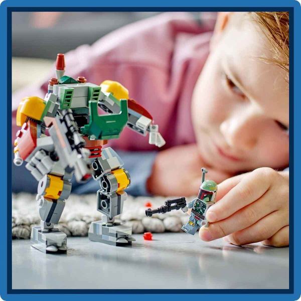 Hareketli Robot Zırh: Boba Fett LEGO mini figürü için açılan bir kokpit, blaster tüfeği için bir klips, büyük mermi atan blasteri tutmak için kavrayıcı eller ve aksiyon oyunları için atıcılı büyük bir jet çantası bulunur. Boba Fett LEGO minifigürü, robotun kokpitinde giyebileceği kendi jet çantasına sahiptir.