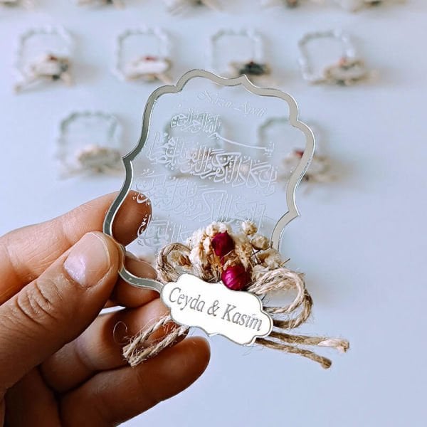 İsim etiketi üzerine gelin damat adı, tarih ve nişan, nikah hatırası vb. ek bir bilgi girilebilir. İsim etiketi üzerine yazılacak yazının 3 satırı geçmemesi tasarımın kapanmaması adına önemlidir. Ön kısıma uygulanan süslemenin tam arakasına gelecek şekilde yuvarlak mıknatıs yapıştırılarak, desenli şekilde dizan edilmiş pleksi hediyelik modeli dolap süsü magneti olarak kullanıma uygun hale getirilmiştir.