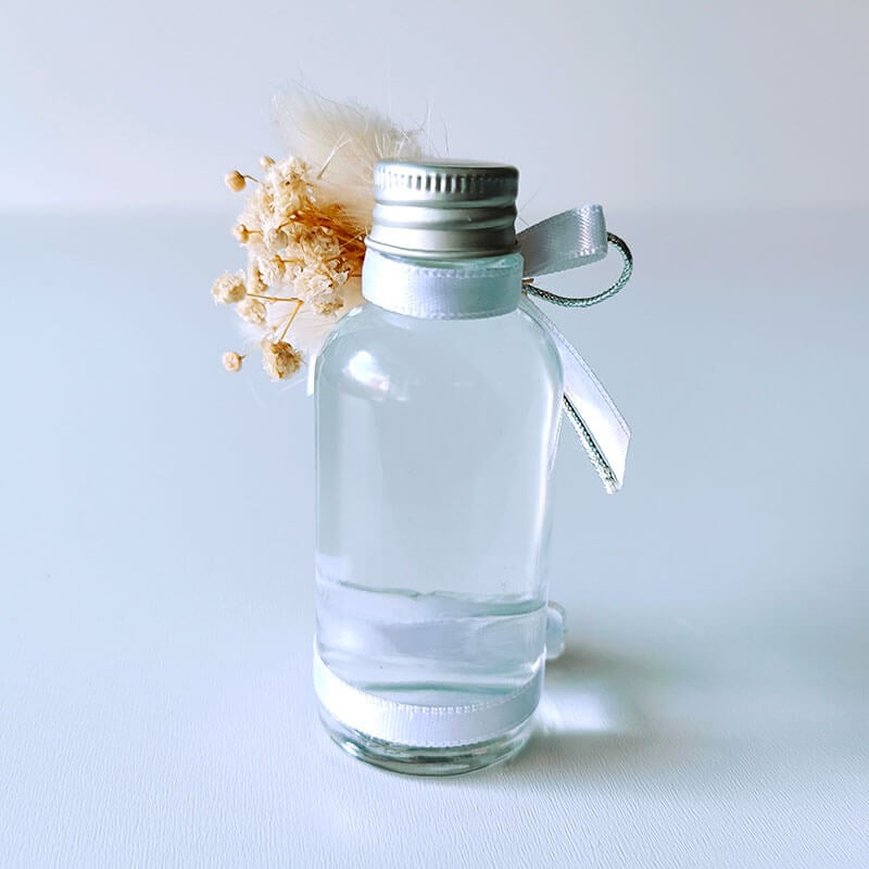 Zerafet timsali bu nikah şekeri hediyeliği modelimiz mini şurup şişesi formundadır. İçerisine tercihe bağlı şeffaf veya renkli kolonya doldurulabilir. Cam şişenin üst boyun bölümündeki süsleme şu şekildedir. Doğal cipsolardan mini bir demet ve bu çiçek demetin içerine ise 2 adet tüy otu kullanılarak hazırlanmıştır. 6mm kurdele, varaklı gümüş renk iplik ile fiyonklu bir şekilde bağlanmıştır. En ön kısma ise mini kristal taş yerleştirilerek üst kısım tasarımı tamamlanmıştır.