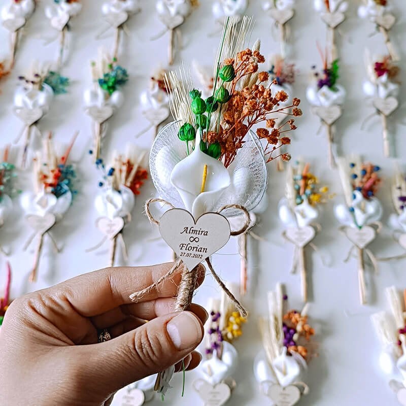 Doğal cipso çiçek demeti, bir tutam keten tohumu otu, 2 adet kurutulmuş başak sapları uzun tutularak bir araya getirilir. 2 adet tül raket içine konulmuş badem şekeri renkli çiçek demetinin sağına ve soluna gelecek şekilde yerleştirilir. Buraya kadar kullanılan tüm malzemeler doğal olup özenle kurutuldukları için deforme olmadan dayanıklılık süreleri uzatılmıştır. Demetin en kısmına ise yapay gala çiçek yerştirilerek hazırlanan mini demet alt saplarından ince hasır ip yardımı ile sarılır. Hediyeliğin orta kısmına yine ince hasır ip ile hazırlanan fiyonk ve onun üzerine gelecek isim etiketi ile hediyelik tasarımı tamamlanmış olur. Çiçek demetinin arkasına orta kısma yapıştırılan yuvarlak mıknatıs ile nikah hediyeliği modeli aynı zamanda buz dolabı magneti olarak da kullanımı sağlanmış olur.