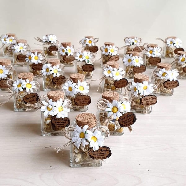 Nikah hediyelikleri ürünlerinde süsleme renkleri zevkinize göre değişebilir. Özgün tasarımı ile nikah hediyeliği haline getirilmiş papatyalı mantar tıpalı kare şeklinde cam şişe modelini beğeneceğinizi düşünüyoruz.