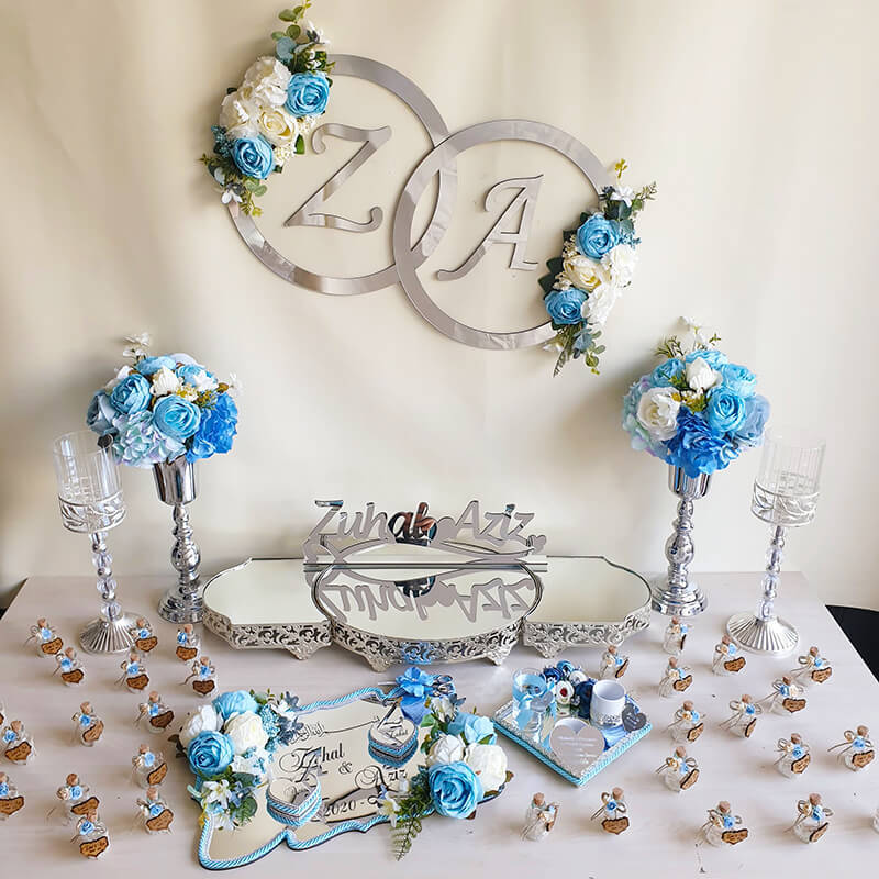 Bu setin hazırlanmasını sağlayan Zuhal ve Aziz çiftimize bir ömür mutluluklar dileriz. Kendileri gümüş ana renkler üzerine nişan elbiselerine uyumlu olacağını düşündükleri için krem ve bebe mavisi renklerle süsleme detaylarının kullanılmasını tercih etmişlerdir.