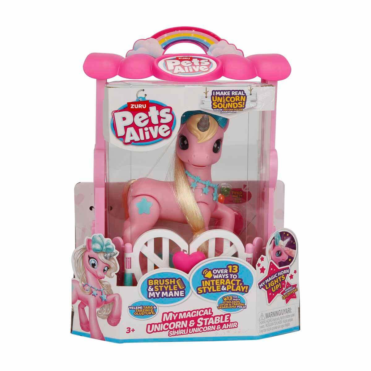 Pets Alive Sihirli Unicorn Sesli ve Işıklı Oyun Seti PEL02000 kutusu içinde; 1 adet pembe renkli Unicorn, 2 kapılı minik ahırı, tarak ve havuç kutunun içinde mevcuttur.